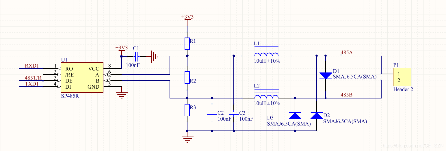 图中钳位于6.5V的管D1,D2,D3,都是为了保护RS485总线的,避免受外界干扰,也可以选择集成的总线保护原件。另外图中的L1,L2,C2,C3为可选安装原件,用于提高电路的EMI性能.