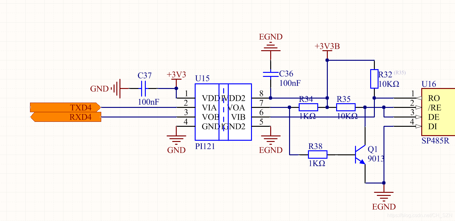 默认没有数据时,TX为高电平,三极管导通,RE为低电平使能,RO收数据有效,SP485为接收态。